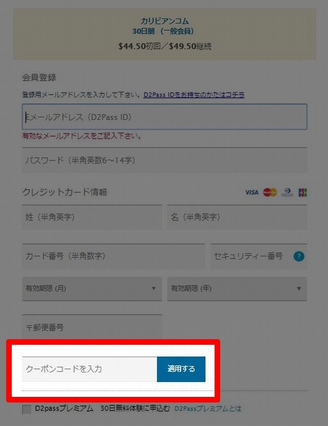 2.入会フォームの下のほうに「クーポンコードを入力」欄があります。