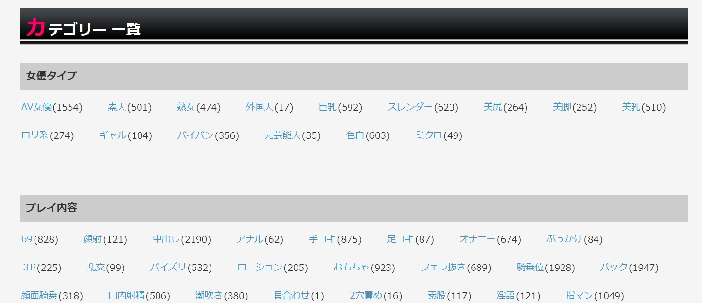 作品の女優のカテゴリー別で見てみると、AV女優(1300本)、素人(430本)、熟女(390本)、外国人(15)巨乳(522) スレンダー(582)美尻(240) 美脚(233)・・・と続き人AV女優から熟女、人妻、素人・・というように出演女優のタイプは多岐にわたっています。